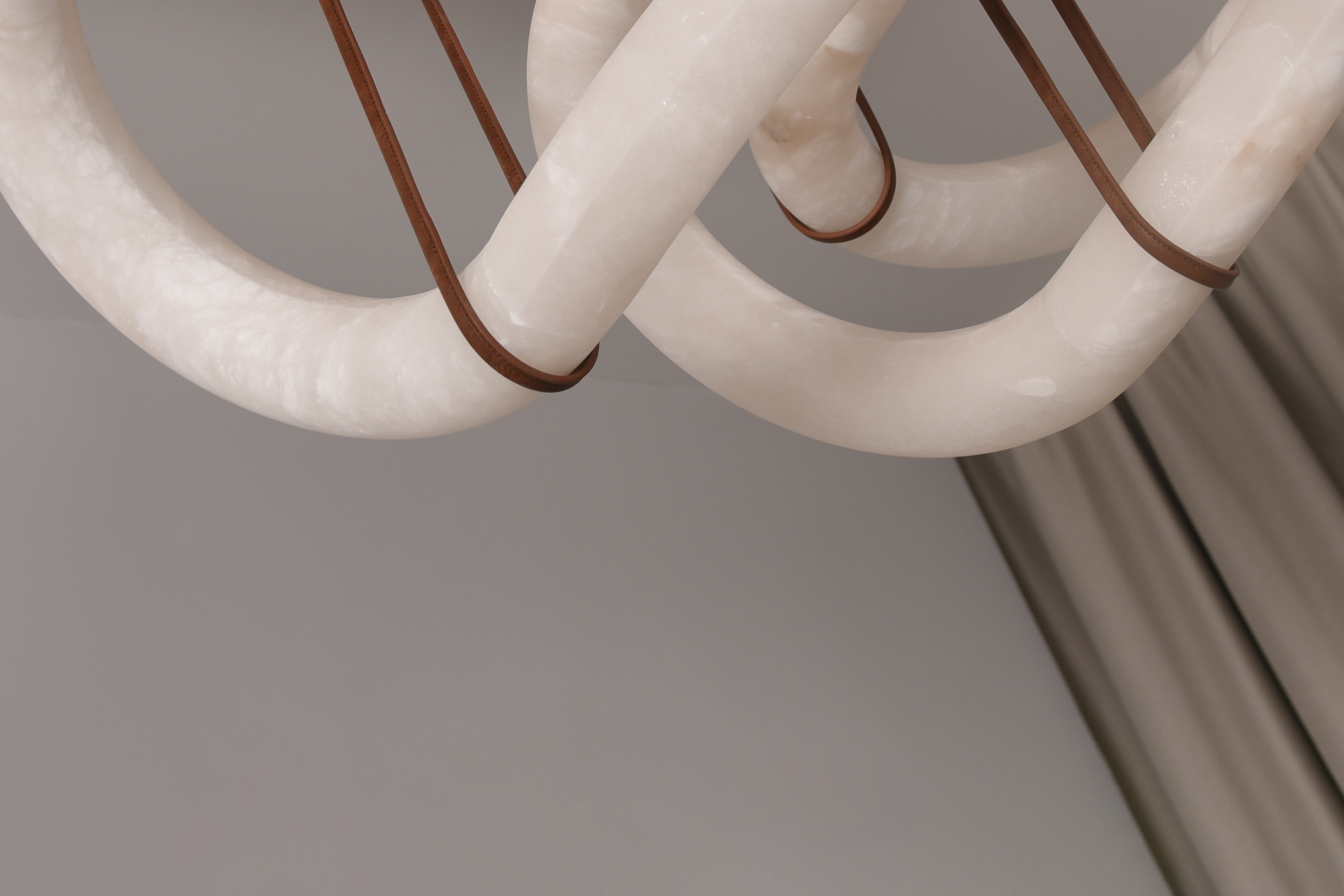 The design centers around an interconnected, infinity loop form, creating a visually captivating and sculptural lighting fixture. The soft, diffused glow from the alabaster contrasts with the sleek leather cords, resulting in a modern and artistic aesthetic. The design allows for the infinity loop to be a focal point, adding to the design of the product.