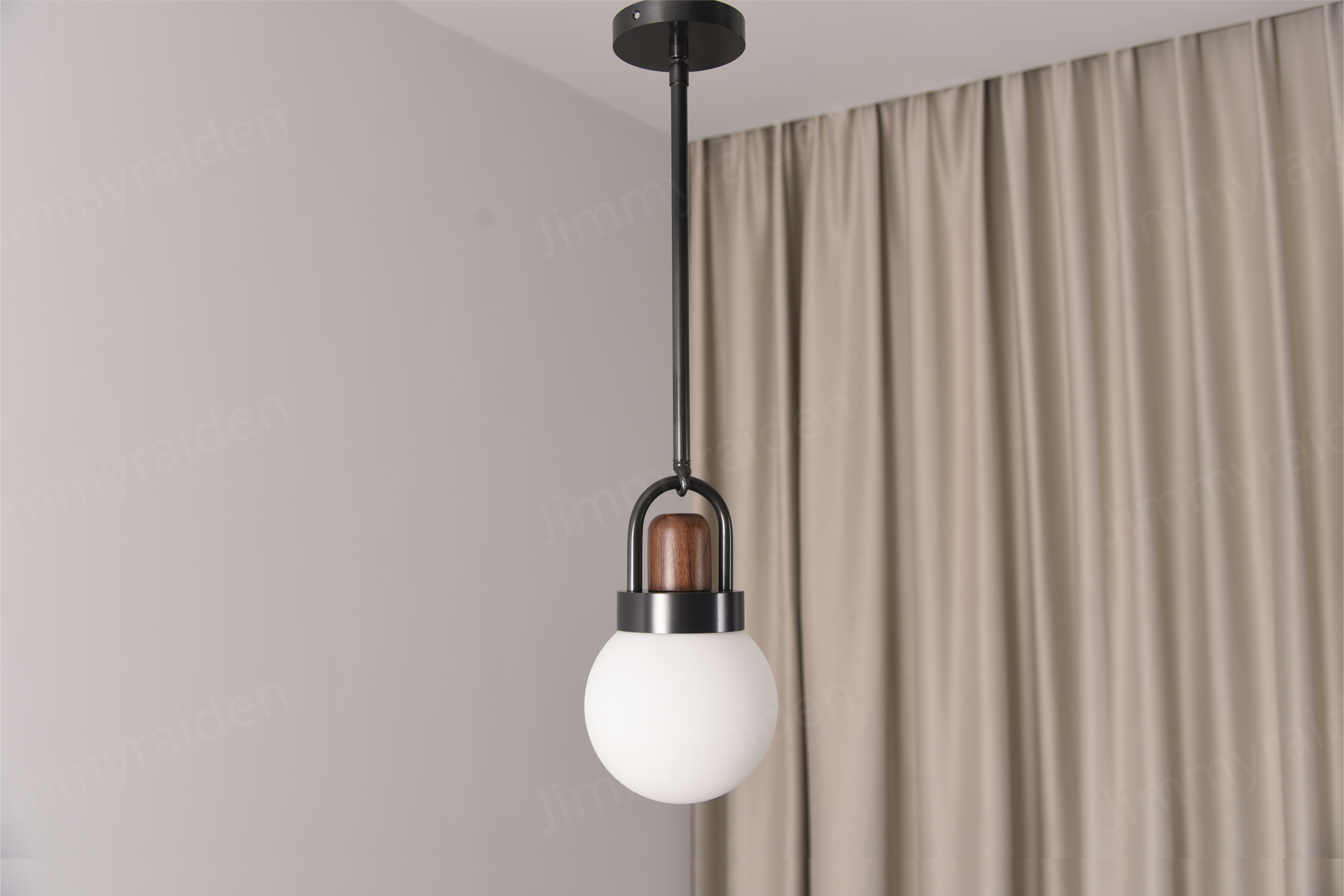 The Walnut Globe Bronze Pendant is crafted from a harmonious blend of brass, walnut wood, and glass. The brass components feature a finish that complements the design, providing a sturdy and elegant suspension. The rich walnut wood element is carefully integrated above the glass, adding a touch of natural warmth, while the spherical glass shade is expertly formed to ensure uniform light diffusion.